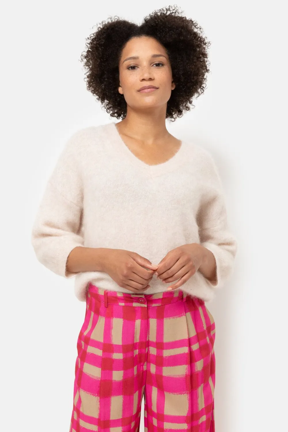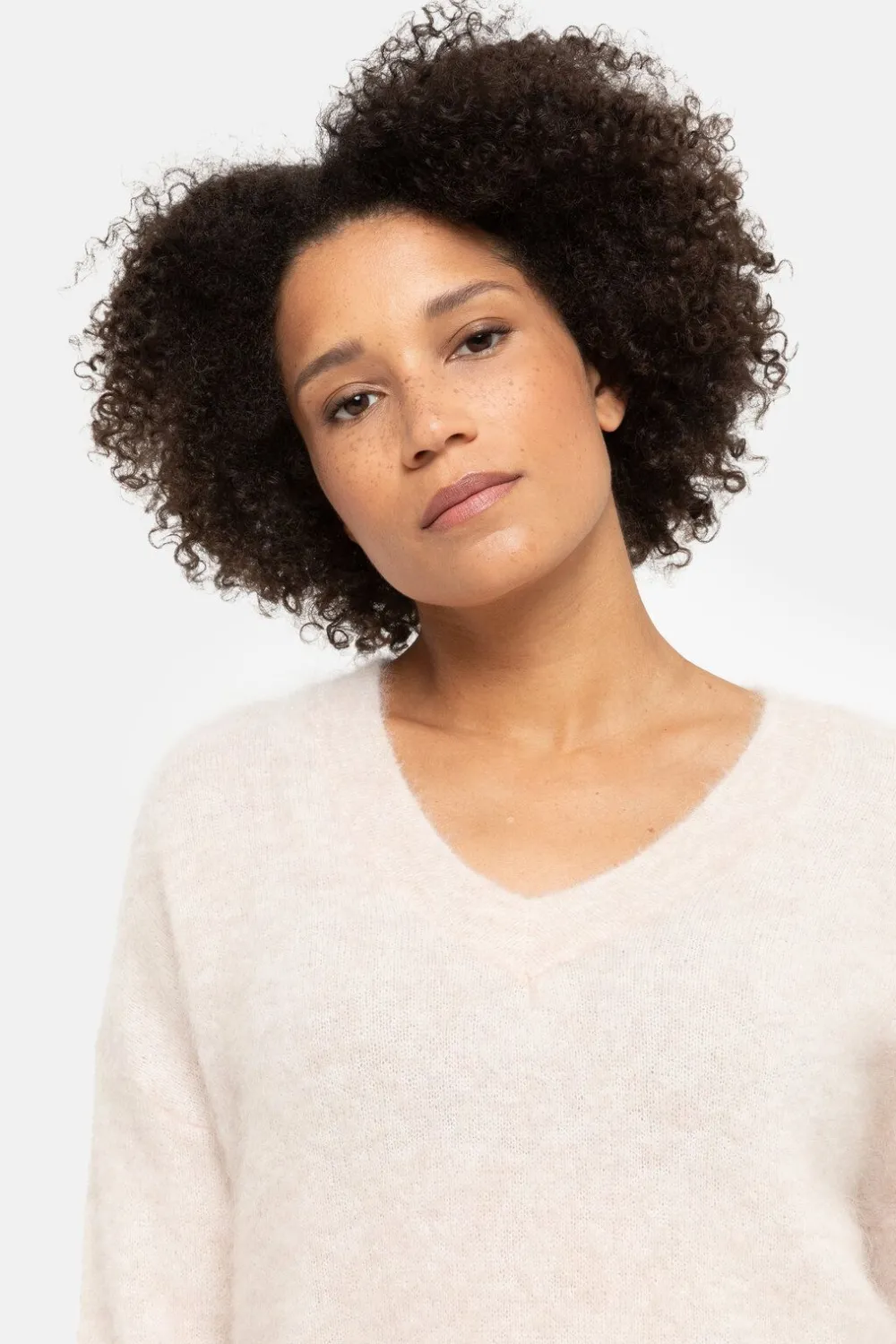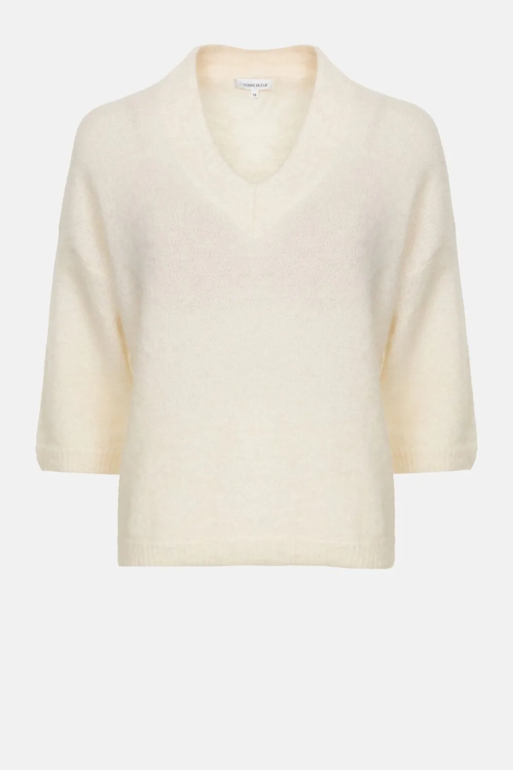Ecru Damespull In Een Zachte Wolmix.Een Vrouwelijke Boxysnit Met Een Wijde V-Hals.En Elegante Driekwartmouwen Met Lage S…